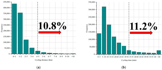 (a) Distribution characteristics of user cycling distance; (b) distribution characteristics of user cycling time.