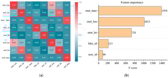 Subsequently, using the XGBoost algorithm, this study conducts feature importance analysis on all input features. Figure 5b illustrates the results. It is evident that the departure time feature holds the greatest importance in the prediction process of the model, followed by the departure location’s significance. Notably, the user ID and bike ID features have the least importance in the model’s prediction, aligning with the results of Pearson correlation analysis among the variables.