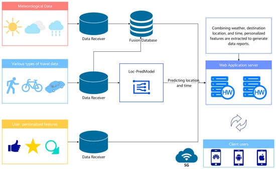 After acquiring user preference features, they are integrated with the weather data produced by the prediction model to generate personalized weather reports. The process, illustrated in Figure 7, entails the recommendation system gathering weather data, user travel data, and user-specific features. Leveraging the Loc-PredModel previously discussed, the system predicts the user’s location and time. Subsequently, the weather data, travel data, and user-specific feature data are transmitted to the application server, where they are amalgamated to generate data reports incorporating weather conditions, destination location, and time. These personalized reports are subsequently disseminated to user terminals through the 5G messaging platform.