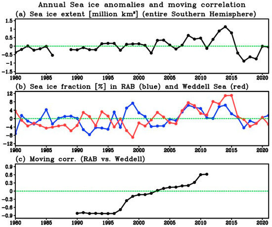 (a) Time series of annual mean NSIDC sea ice extent anomaly (million km2) averaged over the entire Southern Hemisphere. (b) Time series of MERRA-2 sea ice fraction anomaly (%) for the Ross–Amundsen–Bellingshausen (RAB) Sea denoted by blue line and for the Weddell Sea denoted by red line. (c) Moving correlations between the sea ice fraction from RAB and Weddell Sea shown in (b). The 21-year sliding window is applied to calculate the moving correlations. In three panels, green dashed lines represent the zero line. A significant change in correlation is evident when comparing the 20th century (with a negative correlation) to the 21st century (exhibiting a positive correlation). According to a t-test with N-2 degrees of freedom (where N equals 21), the critical correlation value at a 95% confidence level is approximately ±0.43.