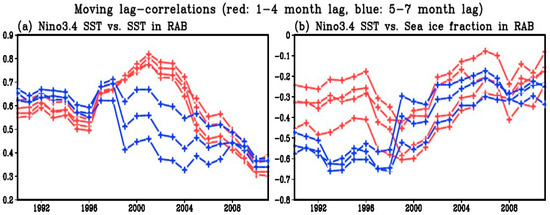 Time-lagged moving correlations over the 1980–2021 period applying a sliding window spanning 21 years. The left panel (a) shows the correlations between the Niño3.4 SST and SST over the Ross–Amundsen–Bellingshausen (RAB) Sea while the SST over the RAB is switched to sea ice fraction in the right panel (b). Results are plotted in red lines for time-lags of 1 to 4 months and blue lines for time-lags of 5 to 7 months. The critical correlation value at a 95% confidence level, based on a t-test with N-2 degrees of freedom (where N equals 21), is approximately ±0.43. Positive relationship between the two SSTs in the left panel and negative relationship between the Niño3.4 SST and sea ice fraction in RAB is stronger in the late 20th century. Amplitudes of correlations are also larger for longer time-lag in the late 20th century, while that feature is not evident in the early 21st century.