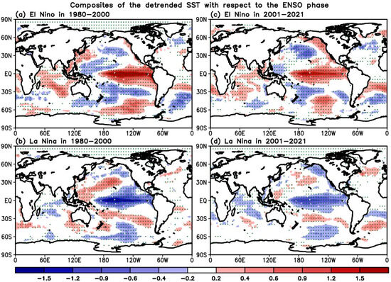 An important question is why there is a significant decadal change in this correlation. In association with the possible role of ENSO in this correlation change, it is found that there is a notable change in type and intensity of ENSO from the L20 to E21 period. For example, the observational data on SST anomalies in the equatorial Pacific indicates that the EP-type ENSO events are relatively more frequent during the L20 compared to the E21 [31,32,33]. The composite analysis of SST anomalies during ENSO events in Figure 4 clearly demonstrates that in the L20 period, the SST anomaly distribution extends prominently to the eastern equatorial Pacific, resembling the EP-type ENSO pattern (Figure 4a,b). Conversely, the maximum amplitude of the SST anomaly in the E21 period is found in the central equatorial Pacific with a less pronounced extension towards the far eastern Pacific for both ENSO warm and cold events, similar to the CP-type ENSO pattern (Figure 4c,d). Comparison in the SST variance between the L20 and E21 period over the Niño3 (150–90° W, 5° S–5° N) region indicates decadal change in the EP-type ENSO activity, yielding 1.53 during L20 and 0.84 during E21. SST variance in the Niño4 (160° E–150° W, 5° S–5° N) region shows that the CP-type ENSO activity is 0.67 in L20 and 0.79 in E21. These SST variances clearly indicate more active EP-type ENSO during L20 and CP-type ENSO during E21.