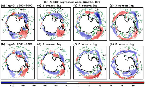 Distribution of SST (green contoured) and sea ice fraction (shaded) anomaly regressed onto the boreal winter Niño3.4 SST (averaged for December, January, and February). Each panel from the left to the right represents the regressed distributions considering 0, 1, 2, and 3 season lag. Results for the late 20th century are shown on the upper panel (a,c,e,g) while the lower panel (b,d,f,h) corresponds to the result for the early 21st century. The regressed anomaly over the Ross–Amundsen–Bellingshausen Sea reaches the maximum at 2 season lag in the late 20th century, while the amplitude gets weak at the same lag in the early 21st century. Black stippled areas indicate that the anomalies are statistically significant at 95% confidence levels.