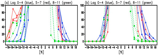 The number of grid points (y-axis) with respect to the regressed sea ice fraction (SIF) anomaly values (%, x-axis) distributed over the longitudes encompassing the Ross, Amundsen, Bellingshausen, and Weddell Sea. The regression is conducted onto the boreal winter Niño3.4 SST. Different colored lines (blue, red, and green) illustrate the outcomes for regressions at lags of 0–4 months, 5–7 months, and 8–11 months. In the left panel (a), the focus is on the late 20th century, while the right panel (b) pertains to the early 21st century. The most significant decrease in SIF occurs at a lag of 5–7 months (indicated by the red lines) during the late 20th century (left panel, (a)).
