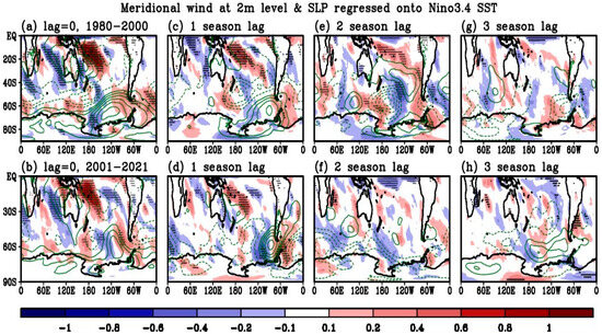 Same as Figure 5 but for regressed anomalies of 2 m level meridional flow (shaded) and sea level pressure (green contoured). Results for the late 20th century are displayed in the upper panel ((a,c,e,g)) while the lower panel ((b,d,f,h)) represents the result for the early 21st century. Specifically, time-lagged response lasts longer and the meridional flow over the Ross–Amundsen–Bellingshausen Sea reaches the maximum in the late 20th century (e), while the lagged response gets weak at the same lag in the early 21st century (f).