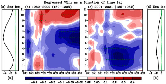 Shaded (b,c): Latitude (x-axis)-time-lag (y-axis) cross-section of the 2 m level meridional wind anomalies regressed onto the boreal winter Niño3.4 SST. X-axis denotes the latitude from 90° S to 45° S and y-axis denotes the time-lag ranging from 0 to 11 months. The left panel (b) represents the result for the late 20th century while the right panel (c) is the result for the early 21st century period. Longitudinal width for averaging the meridional winds is 150–120° W that covers the Ross and Amundsen Sea for the late 20th century (left (b)) and 135–105° W that covers the Amundsen and Bellingshausen Sea for the early 21st century (right (c)). Green stippled areas indicate that the anomalies are statistically significant at 95% confidence levels. Time series in black (a,d): Regressed sea ice fraction anomaly over the Ross and Amundsen Sea in the late 20th century (left (a)) and the Amundsen and Bellingshausen Sea in the early 21st century (right (d)), respectively, as a function of time-lag from 0 to 11 months. X-axis denotes the regressed anomaly in percentage. Green dashed lines in panels (a,d) represent the zero line. The contrast is evident: during the late 20th century (a,b), the prevailing negative wind anomaly (poleward northly flow depicted by blue shading) is most pronounced at lags of 5–7 months, resulting in the greatest reduction in sea ice at those lags. Conversely, in the early 21st century (c,d), the most robust poleward northerly flow is seen at lags of 0–4 months, aligning with the highest sea ice reduction at those lags.