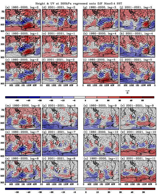 Distributions of 300 hPa level wind (vector) and geopotential height (shaded) anomalies regressed onto the boreal winter Niño3.4 SST. Time-lagged regression of the wind and geopotential height is conducted considering time-lags of 0 to 11 months onto the boreal winter Niño3.4 SST. The first ((a–c,m–o)) and the third column ((g–i,s–u)) from the left represent the results for the late 20th century, and the results for the early 21st century are shown in the second ((d–f,p–r)) and the fourth column ((j–l,v–x)). Specifically, the northwest–southeast-oriented regressed anomalies in the Pacific at lags of 0–3 months ((a–c,g)), followed by zonally oriented high/low-pressure anomalies remaining active at lags of 5–7 months ((i,m,n)), are dominant in the 20th century, while the regressed anomalies weaken earlier and are no longer evident after a 5-month (p–r) lag in the 21st century.