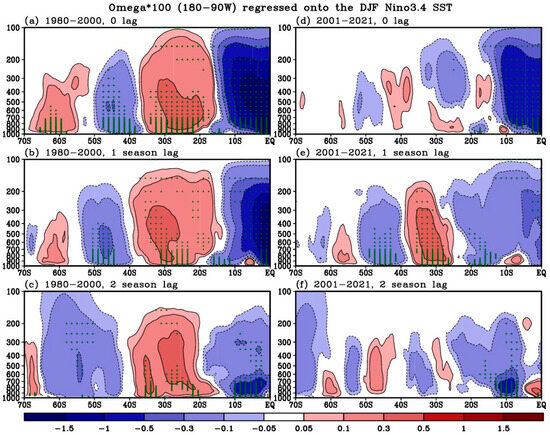 Latitude–height cross-section of the vertical pressure velocity at each pressure level regressed onto the boreal winter Niño3.4 SST. Longitudinal width for averaging is 180–90° W that encompasses the central to eastern Pacific. The left panel (a–c) is the result for time-lag of 0 to 2 seasons in the late 20th century while the right panel (d–f) represents the result for the early 21st century period. Green stippled areas indicate that the anomalies are statistically significant at 95% confidence levels. Vertical circulation cells spanning from the tropical Pacific to Antarctica is well-structured during the late 20th century (left, (a–c)), while the vertical structure is less well-organized in the early 21st century (d–f).