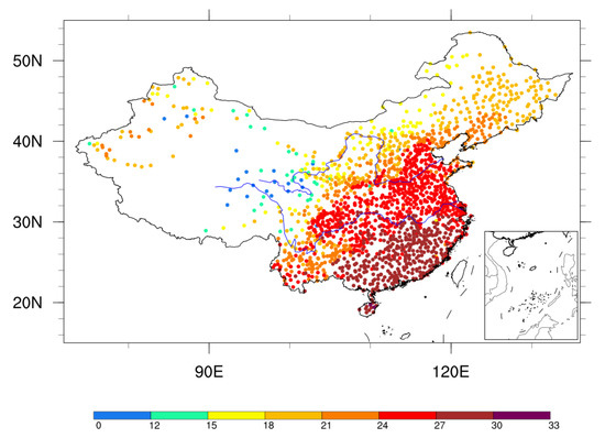 Figure 1 illustrates the spatial distribution of the climatic regimes of the average daily maximum wet bulb temperature TW (°C) for the months of May–September from 1960 to 2015. As shown in the figure, the overall spatial distribution of the mean daily maximum wet bulb temperature decreases from the southern to northern regions. In the northeastern and northwestern areas of China, the average TW value is lower than 24 °C, and in the Guangzhou and Yunnan Provinces, the average TW value is higher than 27 °C, especially in Hainan, where the maximum value reaches 33 °C. These areas belong to the tropical and subtropical regions. In line with recent studies, extreme TWs are highly prevalent in the southernmost part of China, and extreme TWs usually persist for a long time in Southeastern and Northeastern China [20]. If the minimum duration of extreme TWs is required to be three days for the statistics, the highest incidence of extreme TWs will be located in Southeastern China, which is consistent with the region of extreme TWs with longer durations. Moreover, the annual maximum magnitude of extreme TWs shows a positive gradient from Southern to Northern China [12]. This is consistent with the spatial distribution of the daily maximum wet bulb temperatures for the statistics in this paper.