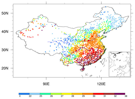 In this study, the observed daily station records of temperature were taken from the China Meteorological Data Center (http://data.cma.cn/en/?r=data/detail&dataCode=A.0012.0001, accessed on 25 July 2023.).