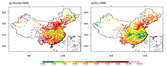 In addition, dry heat wave events are events defined on the basis of maximum daily temperatures, whereas humid heat wave events are defined on the basis of wet bulb temperatures, i.e., they need to take into account both temperature and humidity as co-conditions. Therefore, the occurrence and persistence of humid heat wave events require that the humidity conditions in the region also meet the definitional requirements. Thus, the average duration of dry heat waves in the whole China region is greater than the average duration of humid heat waves, especially in the northern region of China, where the maximum difference between the dry and humid heat wave HWDs reaches more than 2 days. In addition, Wang et al. [12] revealed that humid heat waves over Southern China are dominated by large-scale circulations similar to those during dry heat waves, while humid heat waves over semi-arid and arid regions are usually accompanied by upward motions (convections), which inhibit the persistence of humid heat waves [12], consistent with the shorter duration of humid heat waves compared to the dry ones.