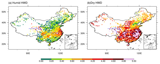 Spatial distributions of seasonal averages of (a) humid and (b) dry HWD (days/event) during 1960–2015.