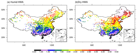 Spatial distributions of seasonal averages of (a) humid HWA and (b) dry HWA (°C/day) during 1960–2015.