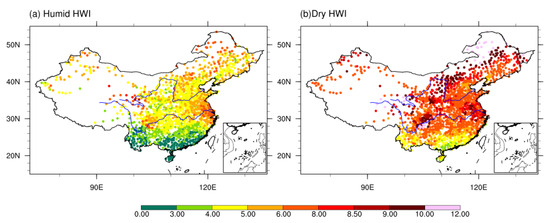 Spatial distributions of seasonal mean (a) humid and (b) dry HWI (°C/event) during 1960–2015.