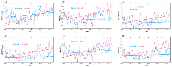 Annual mean of (a) HWN, (b) HWD, (c) HWA, (d) HWI, (e) HWF, and (f) HWTI for dry and humid heat waves over time, where the value R denotes the linear trend of interannual variability over a period of 55 years. (*) denotes the values at 95% significance level, with the solid blue line denoting humid heat waves and the solid red line denoting dry heat waves.