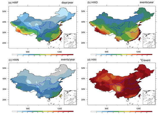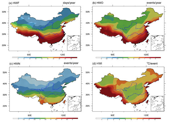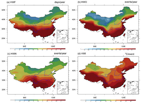 For the case of higher-emission scenarios (RCP8.5), the features of the dry and heat waves indices are shown in Figure 11 and Figure 12, respectively. As shown in Figure 11, the spatial patterns of the frequency, duration, and number of dry heat waves still display a “south more, north less” pattern, but with a higher (almost double) magnitude than that in the RCP4.5 scenario. Especially in the case of the HWN, all the regions show a greater number of heat waves, with higher values over the southern parts of China (more than five times per year). The spatial distributions of the HWF, HWD, HWN, and HWI for humid heat waves under the RCP8.5 scenario (Figure 12) show similar patterns to those under the RCP4.5 scenario, but with more than double the magnitude for all indices according to the values indicated by the color bar. Compared to the dry heat waves (Figure 11), all of the indices have much higher values, especially over the southern regions and the coastline of China, which indicates more severe heat extremes thereof. These results suggest that when the effects of moisture are included, humid heat waves are projected to have a longer duration and higher number, intensity, and frequency than dry heat waves in the future, under both the RCP4.5 and RCP8.5 scenarios. Hence, more areas in China will experience higher-frequency, more intense, and longer-duration humid heat waves with a greater total number of days than dry heat waves in the future.