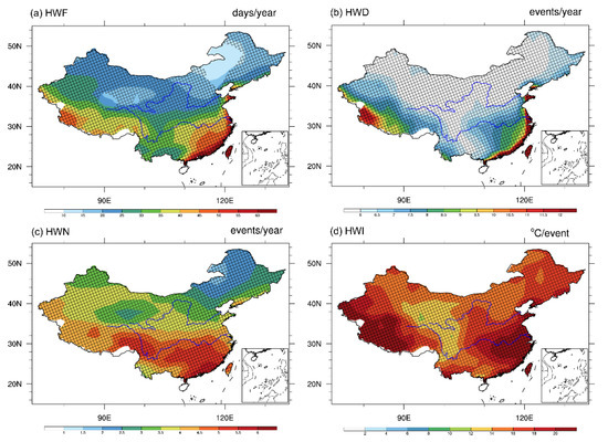 - Ding, T.; Qian, W.; Yan, Z. Changes in hot days and heat waves in China during 1961–2007. Int. J. Climatol. 2010, 30, 1452–1462. [Google Scholar] [CrossRef]