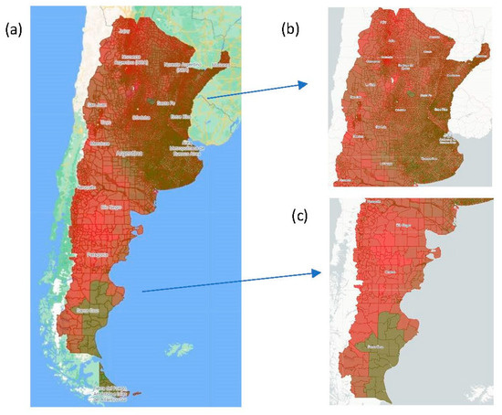 . 1. (a) Map of Argentina, (b) central and northern regions of the country, (c) southern regions of the country. Source: https://mapa.poblaciones.org/map/142301/#/@-37.231225,-60.149513,5z/l=312801!v0!w0 (Accessed on 6 August 2023).