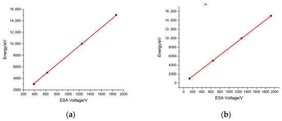 Figure 3 shows the fitting results of the electrostatic analyzer factor of the ion/electron sensor. The electrostatic analyzer factor of the ion sensor was 8.03 ± 0.03, compared to 7.81 ± 0.02 in the case of the electron sensor. The scanning voltage of the electrostatic analyzer could reach between 3~4000 V. According to the fitting result of the electrostatic analyzer factor and Equation (1), the electrostatic analyzer factor of the ion sensor was 8.03 ± 0.03, and the measured electron energy range was 23.7 eV~31.6 keV.