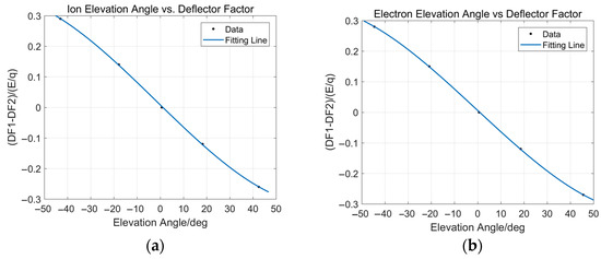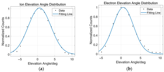 Figure 5a,b. By Gaussian fitting multiple ion and electron energy points at the elevation angles, the elevation angle of the ion sensor was determined to be 0.58° ± 0.13°, while the elevation angle of the electron sensor was 0.56° ± 0.02°.