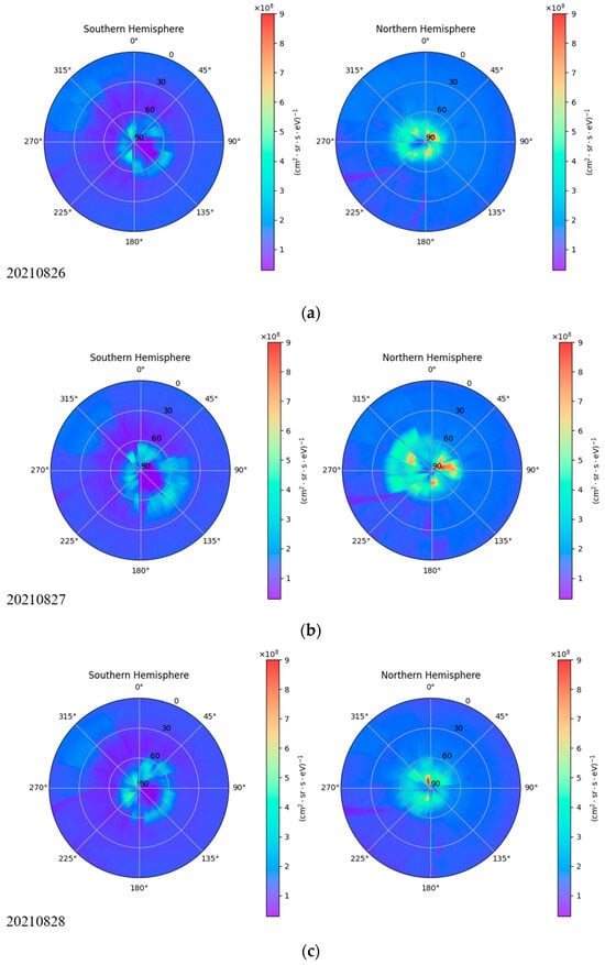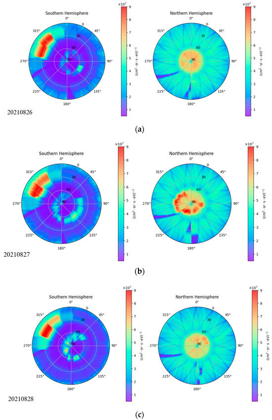 9]. Both the SSJ and TED are detection tools for measuring charged particle fluxes, and they can detect the electrons and ions that are injected into the upper atmosphere from the near-Earth space environment. The SSJ/5 was developed using a single triquadraspheric ESA to measure the electron and ion fluxes from a low energy of 30 eV to 30 keV. Its scope of view was 4° × 90°, in a 90-degree direction divided into six directions. The TED detected the total electron and ion fluxes from 300 eV to 20 keV using two cylindrical curved plate ESAs in two energy channels. The scope of view of the curved plate field covered approx. 40°. The FY-3E satellite observes the ionosphere with an orbit altitude of approx. 830 km. Its orbit limits the observable precipitating particles that mainly originate from the ring current, solar wind, and magnetospheric plasma sheet. Therefore, the PMA mainly observes the energy spectra of the precipitating particles that can produce more visible auroras. Compared with the SSJ/5 and TED, the PMA can obtain extensively spatial coverage, a more detailed plasma spatial distribution, and energy distributions.