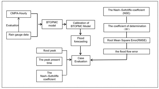 Therefore, the further enhancement in the integration of these multiple sources of information, such as ground observations, radar measurements, and satellite remote sensing, is necessary, and their analysis, study, and application are important aspects of the current development of basin hydrological simulation and prediction forecasting techniques [18]. The National Weather Service’s Office of Hydrologic Development and NOAA’s National Severe Storms Laboratory jointly launched the National Mosaic and Multisensor QPE Project (NMQ) working pilot program with a view to improving the resolution and accuracy of precipitation data. With the support of this program, the fusion techniques of radar inversion, satellite remote sensing, ground observation, and other multisource data have developed rapidly [20]. The vast size of China and the very complex topography have caused practical difficulties in radar networking, which has created difficulties in developing satellite–radar observation triple-source fusion precipitation products [21,22]. The Meteorological Information Center of the China Meteorological Administration developed a multisource data fusion suitable for the distribution of a regional precipitation observation station network [23,24,25,26,27], as well as data-fused ground observation, radar inversion, and satellite remote sensing precipitation. This fused precipitation is more spatially representative than any single-source precipitation data and the ground–satellite two-source precipitation fusion product (two-source fusion) [24,28]. However, currently, these data are mainly used in the meteorological field; the applications in other fields are still relatively few and small, mainly for the analysis of a few regions [29,30]. This fused precipitation is more spatially representative than any single-source precipitation data and ground–satellite two-source precipitation fusion products [24,28], but currently, these data are mainly used in the meteorological field, and the applications in other fields are still relatively few and small, mainly for the analysis of few regions. The study area is the Qingyi River (13,000 km2), a typical watershed in the southwest mountainous region. The main tributaries of the Qingyi River are fan-shaped, and most of the floods in the basin tend to converge at the same time, resulting in frequent floods in the mainstream of the Qingyi River, characterized by the steep rise and fall of floods. The area is mountainous, and its geological conditions are fragile, which is very likely to cause geological disasters. At present, the research on flood forecasting in the Qingyi River basin is still weak, and the high-precision flood forecasting in this region is greatly important for water conservancy projects, flood control, and water resource management. We use CMPA precipitation and hourly observed precipitation from meteorological stations to drive the distributed hydrological model, the block-wise use of the topographic-based hydrologic model (TOPMODEL) (BTOPMC), and separately calibrate its parameters to study the effects of different precipitation products on the accuracy of flood forecasting in a typical watershed in the southwest mountainous region. Meanwhile, because CMPA precipitation data incorporate precipitation information from ground stations, the previous use of ground-observed precipitation to verify the accuracy of precipitation products becomes inapplicable, and the use of the runoff flood forecast effectiveness test can be an effective solution to test the quality of precipitation products. Figure 1 shows the research framework for this research paper.