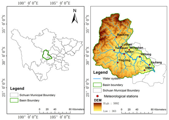 We selected the typical watershed of the Qingyi River in the southwest mountainous region as the study area (Figure 2). It is a tributary of the upper reaches of the Yangtze River and belongs to the southwest mountainous region of China, located on the southeastern edge and under the background of the large topography of the Tibetan Plateau, under the combined influence of large, medium, and small composite topographies with steep valleys, a great variability in atmospheric characteristics, diverse weather and climate, very complex causes, frequent weather and climate disasters, frequent heavy rainfall, and flash floods, and it is a heavy-rainfall area far from the sea in China [26]. Hydrological forecasting in this region is extremely difficult due to the sparse representation of rainfall gauge stations in the area and the weak comprehensive observation capability. The water resources of the Qingyi River become abundant and stable due to adequate precipitation, and the annual water production of each major tributary in the Yangtze River basin ranks among the top three major rivers in China.