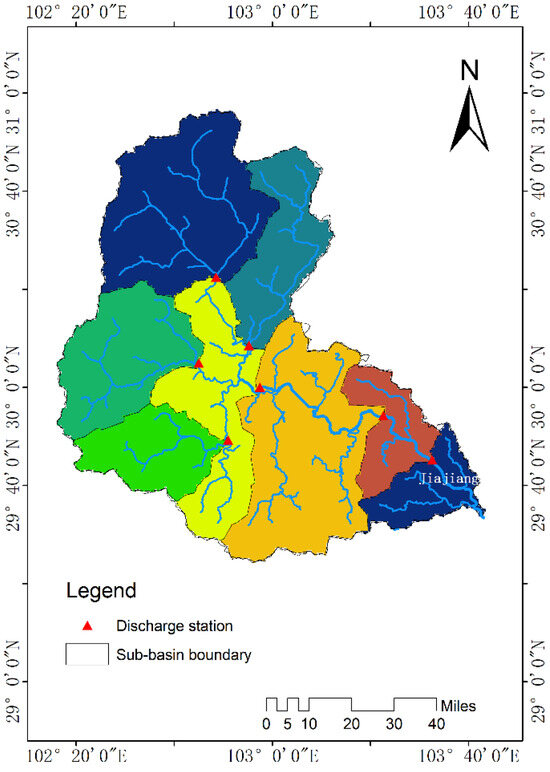 Precipitation data from the observed ground were used, and the data source was http://data.cma.cn/(accessed on 21 June 2021). The Qingyi River basin has 10 rainfall gauge stations (Table 1, Figure 1), and the temporal resolution of precipitation is 1 h. The precipitation period is 2015–2020, and the gauge rainfall data have been quality-controlled. The hydrological station of Jiajiang at the outlet section of the Qingyi River basin was selected (Table 1, Figure 1), and hourly flow data from 2015 to 2020 were used. The discharge station data were obtained from the Sichuan Hydrological Bureau, which is authentic and reliable.
