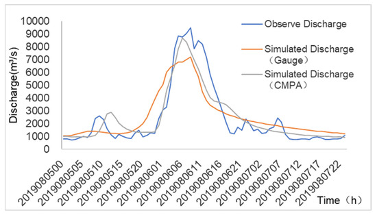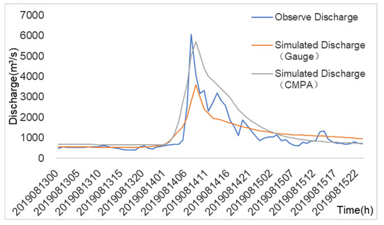 The BTOPMC model can simulate the flood discharge and peak present time more accurately using CMPA data and gauge rainfall data in the Qingyi River. In the flood simulation, accurate prediction of the flood discharge and peak present time in relation to the impact range of the flood and the prediction of the disaster occurrence time is the most important; thus, the accuracy of the simulation is essential.