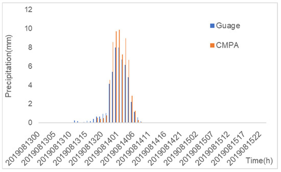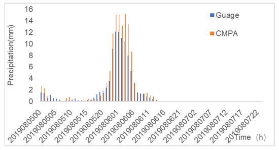 The case of 6 August 2019 is a multipeak flood with a flood peak of 9470 m3/s. The NSE values of flood forecasting using CMPA data and gauge rainfall data are 0.74 and 0.84, respectively, and the accuracies are of class B. The slightly higher NSE for flood simulation using CMPA data may be mainly due to the better simulation of flood peaks (Figure 4). Combined with the temporal variation map of precipitation (Figure 5), the rainfall values calculated using the gauge data are smaller than those calculated using CMPA data during the strongest precipitation period of 6 August 2019 00:00 h–6 August 2019 06:00 h, indicating that the weak representativeness of the gauge rainfall data reduces the amount of rainfall. At the same time, the cumulative precipitation of the flood cases shows (Figure 6) that the gauge rainfall data are discretely distributed in the Qingyi River basin and are under-representative of the strongest rain bands in the basin.