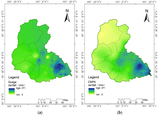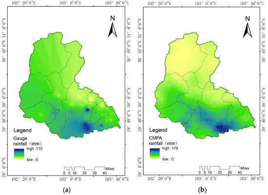 Rainfall comparison of 14 August 2019 field floods: (a) weather station and (b) CMPA.