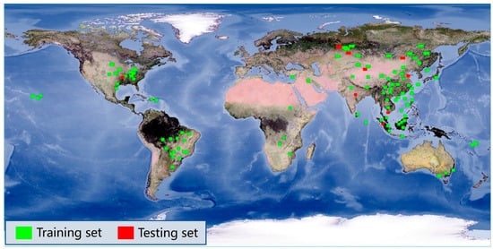 Global distribution of the dataset (green area for the training set; red area for the testing set).