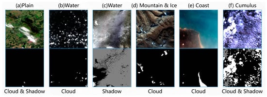 Partial error labels in the original GF1_WHU dataset under different surface types. (The black, white and gray areas represent the underlying surface, clouds and cloud shadows.) At the top of each scene, the type of misjudgment area is given. The bottom presents the main misjudgment targets in the area.