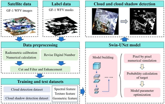 This paper introduces a methodology for cloud and cloud shadow detection using the Swin-UNet model, tailored for four-channel GF-1 WFV multi-spectral remote sensing imagery. Specifically, this study contrasts the detection outcomes of various models by employing preprocessing, data filtering and enhancement techniques and manipulating sample proportions. This study evaluates the feasibility of using the Swin-UNet model to detect clouds and cloud shadows in GF-1 WFV data through various parameter indicators. Additionally, the accuracy and robustness of this model in remote sensing image recognition and segmentation tasks are also the focus of our analysis. This endeavor aimed to address challenges like inadequate precision in cloud and cloud shadow detection and complexities related to boundary segmentation within moderate- and high-resolution imagery. This novel research field attempts to effectively combine machine learning and swarm intelligence methods [,] and has been proven to achieve outstanding results in different fields. In conclusion, a summary and outlook were made on the existing problems.