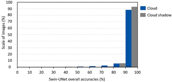 Distribution of Swin-UNet cloud and cloud shadow overall accuracy.