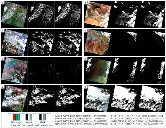 The model’s detection performance exhibits some degree of applicability but frequently yields substantial variations in detection outcomes across different scene contexts. Generally, cloud and cloud shadow detection demonstrate high precision in vegetated regions like grasslands. However, it can occasionally suffer distortion in areas like barren land and water bodies, particularly in terrain scenarios where spectral and texture features exhibit similarities. The model often encounters challenges distinguishing clouds from bright surfaces like ice and snow, as well as distinguishing cloud shadows from dark surfaces like water bodies. In this section, in order to evaluate the applicability and robustness of the model, the results of various land cover scenarios are used for comparative analysis. To be specific, the experimental validation data can be categorized into scenarios including barren land, vegetation, water bodies, urban areas and coastal regions.