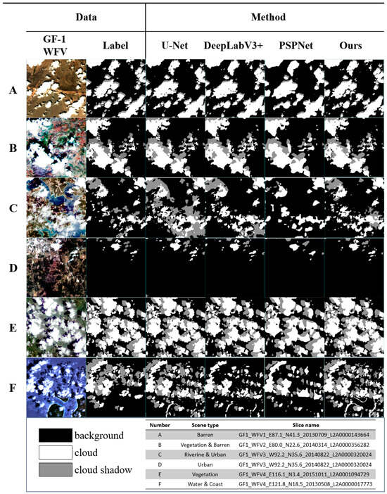 Figure 8 illustrates that the Swin-UNet, employed in this study, exhibits superior segmentation performance in comparison to other models. The Swin-UNet demonstrates strong performance in a majority of scenarios, effectively delineating cloud and cloud shadow areas and their boundaries. However, it exhibits weaker recognition performance in a minority of cases. In scenes featuring barren land and vegetation, all models consistently excel in detecting clouds and cloud shadows, primarily because there are no visually ambiguous ground objects in these environments. However, when faced with water bodies in scenarios C and F, the detection performance is frequently suboptimal. Water surfaces inherently possess low reflectivity and are dark in appearance, which complicates the model’s ability to identify targets, particularly minor clouds above the water. Notably, the Swin-UNet consistently maintains relatively stable performance, providing evidence that the unique attention mechanism of it plays a crucial role in the classification task of remote sensing images. In the case of cloud shadow regions, which are challenging for traditional CNN models to recognize, this model ensures accurate detection while minimizing the likelihood of false positives and missed detections. PSPNet consistently underestimates cloud shadows over water areas, and the model exhibits a relatively smoothed edge detection behavior across all scenarios. This results in challenges related to the missed detection of thin clouds and the loss of edge details. DeepLabV3+ performs relatively well, offering finer boundary detection and capturing minor details within the scenes. However, it continues to disregard the impact of cloud shadows in scene F. In scene D, a bright surface is present in the urban area, resembling the ice and snow area, which can be easily mistaken for clouds. Nonetheless, in this scenario, all models perform admirably, with no conspicuous erroneous detections across a substantial area. In scene F, nearly all experimental models identify the prominent features in the coastal region as clouds. This recognition might be attributed to the textural similarities between these features and actual clouds.