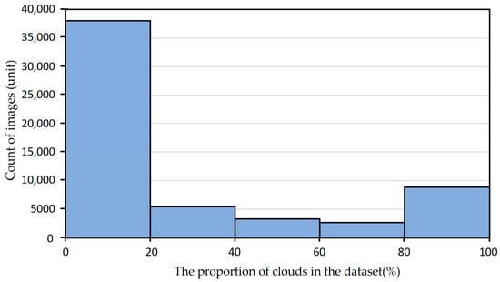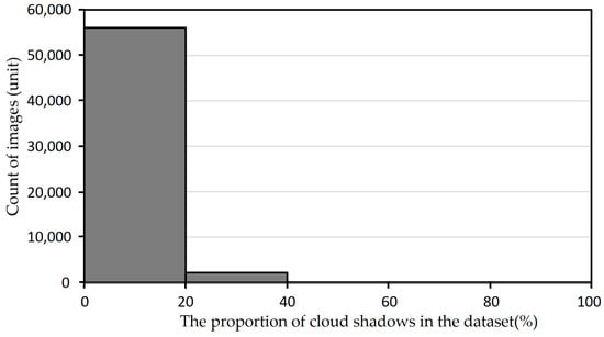 In deep learning models, increased band information frequently enhances classification performance. While high-resolution satellite data offer greater imaging detail, their constrained number of channels restricts the accessibility of image information. Consequently, this limitation partially hinders the capacity of deep learning models to extract data information. Furthermore, in the binary classification of specific targets, the proportion of positive and negative samples constitutes a relevant influencing factor. Figure 9 and Figure 10 depict the cloud coverage and cloud shadow coverage for all images within the dataset. The results indicate that the distribution of clouds and shadows is mostly concentrated within 20%. There are almost no datasets with cloud shadows greater than 40%. Specifically, the dataset’s cloud shadow content is typically limited, encompassing merely 15% of the data, with cloud shadows equal to or exceeding 10%.