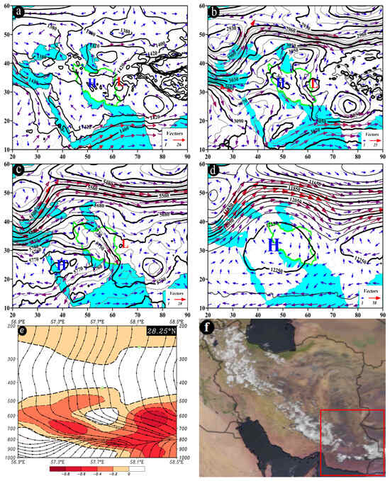 - Saligheh, M. Coordinatin of subtropical-pressure centers in flood-rains of the south and south-easthern Iran. Case study: The rainfall of july 1976. Q. Geogr. Territ. 2004, 1, 105–119. [Google Scholar]