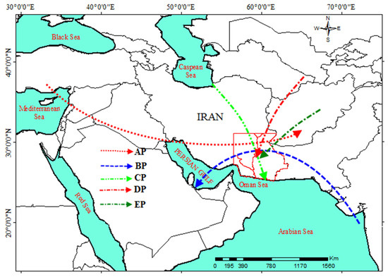 - Alijani, B.; Mofidi, A.; Aliakbari-Bidokhti, A. Atmospheric circulation patterns of the summertime rainfalls of southeastern Iran during July 1994. J. Earth Sp. Phys. 2011, 37, 205–227. [Google Scholar]