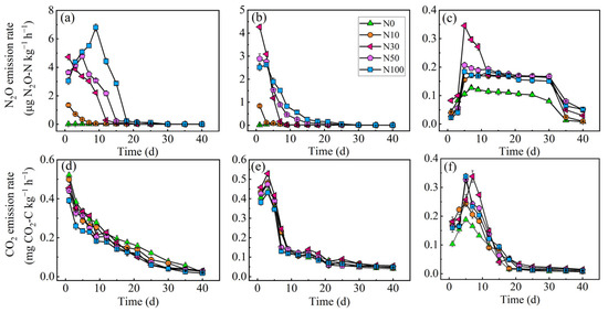 N2O and CO2 emission rate with five N-addition-level treatments. (a) N2O emission rate in HF; (b) N2O emission rate in MF; (c) N2O emission rate in D; (d) CO2 emission rate in HF; (e) CO2 emission rate in MF; (f) CO2 emission rate in D.