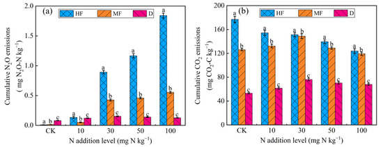 Cumulative N2O emissions and CO2 emissions at different treatments in HF, MF, and D. (a) Cumulative N2O emissions; (b) Cumulative CO2 emissions. a—HF, b—MF, c—D.