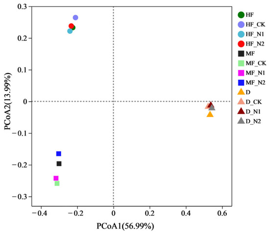 As a result of N addition, the diversity of bacteria alpha (Chao1 and Shannon) significantly increased in MF and D soils. Conversely, it significantly decreased at N100 treatment in HF (Table 6). PCoA analysis of bacterial community structure was shown (Figure 3). In the bacterial community of three points, 13.99% and 56.99% of the variances could be explained by the first and second axes, respectively. Clearly, the bacterial community structure was similar across treatments of the same site, while significant differences were found between different sites (p < 0.05). It indicates that the structural difference of the bacterial community was determined by the sampling site.