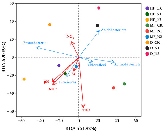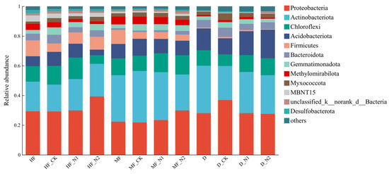 In three points, there is a relative abundance (more than 1%) of bacteria in the bacterial phylum (Figure 4). Proteobacteria and Actinobacteria dominated the bacterial communities, with relative abundances of 49.25–61.27% at three points. In HF, HF_N1 and HF_N2, treatments increased the relative abundance of Proteobacteria by 0.75% and 10.18%, Actinobacteriota by 2.98% and 3.83%, and Firmicutes by 1.92% and 2.99%, respectively, compared with HF_CK treatment. The relative abundance of Chloroflexi and Acidobacteriota was the lowest in HF_N2 treatment and significantly lower than in HF_CK (p < 0.05). In MF, N addition significantly raised Proteobacteria and Chloroflexi relative abundances (p < 0.05) by 8.11% and 2.72% in MF_N2 treatment, respectively. On the other hand, the relative abundance of Acidobacteriota and Actinobacteriota was the highest in the MF_CK treatment, which decreased by 1.59% and 10.50% in the MF_N2 treatment, respectively. Furthermore, as a result of the MF_N2 treatment, the relative abundance of Firmicutes minimized by 0.41%. In D, the relative abundance of Proteobacteria and Firmicutes minimized with increasing levels of N addition, with 9.30% and 0.51% decreases in D_N2 treatment, respectively. However, the relative abundance of Acidobacteriota enhanced by 8.49% in D_N2 treatment (p < 0.05). As a result of the D_N1 treatment, the relative abundance of Chloroflexi and Actinobacteriota were the highest, increasing by 3.51% and 4.85%, respectively.