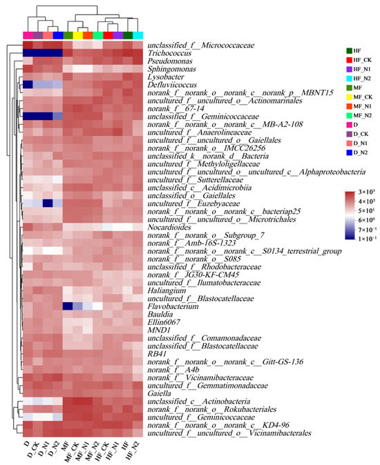 Heatmap of bacterial communities’ (relative abundance > 1%) distribution at the genus level (Figure 5). According to the results, N addition increased the relative abundance of some non-dominant bacteria in three points. In HF, HF_N2 treatment significantly reduced the relative abundance of KD4-96 (from 4.67% to 1.46%) and increased Trichococcus (from 3.75% to 6.34%) and Pseudomonas (from 2.43% to 5.66%) (p < 0.05). MF_N2 treatment significantly reduced Actinobacteria (from 7.25% to 3.34%), Rokubacteriales (from 4.85% to 3.60), Vicinamibacterales (from 4.78% to 2.64%), and 67-14 (from 4.37% to 2.35%) (p < 0.05) in MF soil. In addition, D_N2 treatment significantly increased Micrococcaceae (from 3.25% to 6.94%), KD4-96 (from 1.68% to 4.22%), Vicinamibacteraceae (from 1.97% to 4.47%), and Vicinamibacterales (from 1.80% to 4.73%), while significantly reducing the Gemmatimonadaceae (from 3.21% to 1.95%) in D soil (p < 0.05), with no significant effect on other flora.
