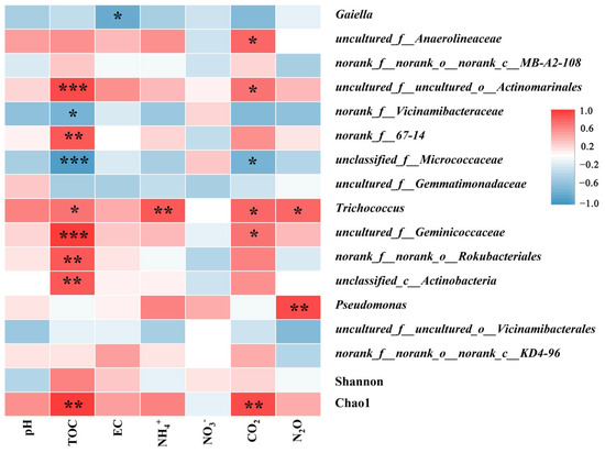 We plotted a heatmap of bacterial and physicochemical properties to reveal how environmental factors affect genus-level bacteria (top 15) (Figure 7). It was clear that the TOC factor was most strongly correlated with the dominant genus. Among them, Geminicoccaceae, Actinomarinales, and TOC were significantly positively correlated (p < 0.001). Micrococcaceae was significantly negatively correlated with TOC (p < 0.001) and CO2 emissions (p < 0.05). Trichococcusand and NH4+ content were significantly positively correlated (p < 0.001). Gaiella was significantly negatively correlated with soil EC (p < 0.05). Meanwhile, a significant positive correlation was found between the Chao1 index and TOC and CO2 emissions (p < 0.01). Pseudomonas (p < 0.01) and Trichococcusand (p < 0.05) were significantly negatively correlated with N2O emissions. Geminicoccaceae, Trichococcusand, Actinomarinales and, Anaerolineaceae, and CO2 emissions were significantly positively correlated (p < 0.05).