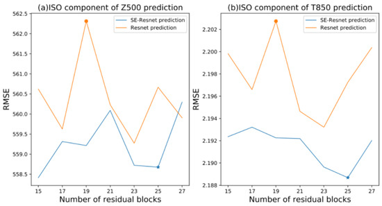 Comparison of the average RMSE for 10–30 days of (a) Z500 (units: m2 s−2) and (b) T850 (units: K) achieved by training the continuous model using different numbers of residual blocks (o and * represent the number of residual blocks used by the ResNet and SE-ResNet models in this paper, respectively).