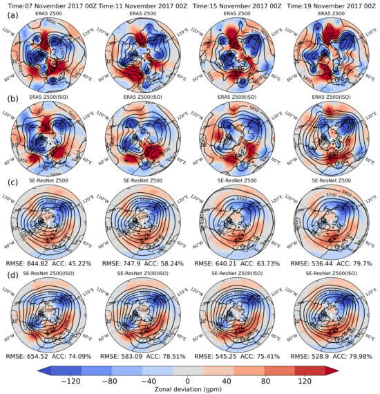 Result and zonal deviation comparison of the model predictions for Z500 (units: gpm) in the Northern Hemisphere (20°–90° N, 180° W–180° E). Forecast lead times from left to right are 14 days, 15 days, 16 days and 17 days, respectively. Row (a) shows the Z500 field in the ERA5 reanalysis dataset. Row (b) shows the intraseasonal component of the Z500 field in the ERA5 reanalysis dataset. Row (c) shows the original Z500 field predicted by SE-ResNet. Row (d) shows the intraseasonal component of the Z500 field predicted by SE-ResNet.