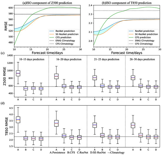 As observed from the RMSE boxplot of the ISO components of Z500 every 5 days (Figure 4c), the RMSE of 75% of the samples predicted by the deep-learning model is below the ERA5 climatological forecast in 10–15 days, and the RMSE of more than 50% of the samples predicted remains below the ERA5 climatological forecast after that. The CFSv2 model predictions have more than 50% of the samples with a higher RMSE than the ERA5 climatological forecast in forecast lead times of 16–20 days and beyond. The persistence forecast is the worst with the RMSE of all the predicted samples being higher than the ERA5 climatological forecast, and the RMSE of more than 75% of the samples is above 1000 m2 s−2. Not surprisingly, the SE-ResNet model has the “best” inaccurate forecast case (RMSE: 672.01 m2 s−2), followed by the ResNet model, CFSv2 model and persistence forecast. For the “best” accurate forecast case, SE-ResNet and ResNet are close, outperforming the CFSv2 model and persistence forecast beyond 16 days. On the other hand, the “best” accurate forecast case of each model is obtained from the lead time range of 10–15 days, where the CFSv2 model has a best case with an RMSE of 346.38 m2 s−2.
