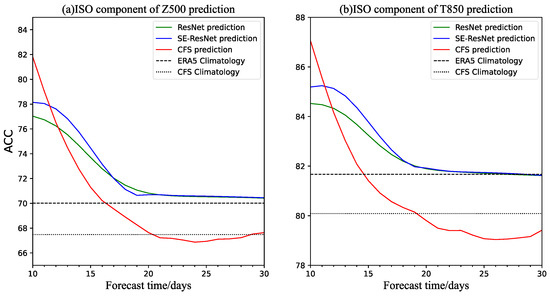 To quantitatively show the spatial similarity between the ISO components predicted by the different models and the ERA5 ISO components, the sequence of the global average ACC of the predicted ISO components for Z500 and T850 with different forecast lead times is given in Figure 5. The results are similar to the RMSE results analysis, and the ACC scores of the deep-learning models are significantly superior to the other models beyond 13 days. Among them, the spatial similarity between the predicted ISO components of the SE-ResNet model and the ERA5 ISO components is the highest, and the ACC of Z500 and T850 for 10–30 days is 72.58% and 82.75%, respectively. Unsurprisingly, its prediction result for 10–30 days is higher than that of the ERA5 climatological forecast. The ResNet model has the second highest ACC skills with an average ACC of 72.25% for Z500 and 82.51% for T850 over 10–30 days. The ACC scores for the Z500 and T850 ISO components predicted by CFSv2 are lower than the ACC score of the ERA5 climatological forecast in approximately 17 and 15 days, respectively, and lower than the ACC scores of the two deep-learning models beyond forecast lead times of 13 days. The CFSv2 ACC score of Z500 and T850 in 10–30 days is 70.11% and 80.8%, respectively. The ACC scores of the persistence forecast are the worst with an average ACC of 47.48% and 65.28% for Z500 and T850 during 10–30 days, respectively.